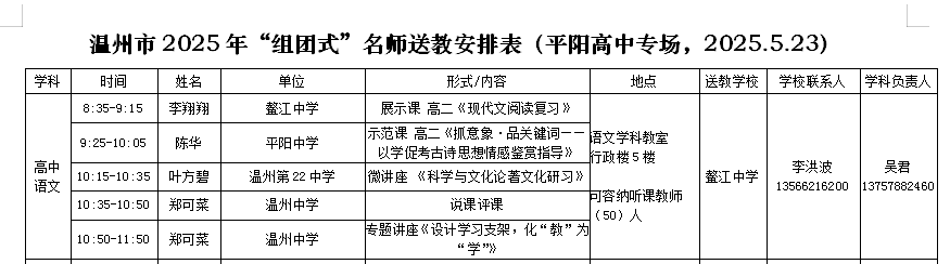 为了推进新课标、新教材背景下的课堂教学,研讨高中语文学业水平考试复习教学,增强教学的有效性,经研究,决定与温州市“组团式”名师送教活动联合举行“普通高中语文学业水平考试复习”研讨活动。现将有关事项通知如下: