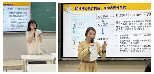 接下来由汤丽静老师带来《教学评一致性的探索——以“四边形的内角和”为例》为题的讲座。汤老师从教学评一致性的内涵、教学评一致性的缘起、教学评一致性的价值意义以及教学评一致性的实施方法等方面,结合课例为大家作详细的分享。以核心素养为导向,目标统领教学全过程,依据核心目标,明确学生学习的具体表现。以目标统领学与教,设计实施表现性任务。应用表现性评价,指向核心素养达成。