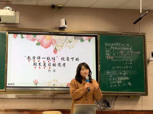 第三项则是温州市南浦实验中学教育集团惠民路分校何萍老师进行了主题为《“教学评一致性”视角下的期末复习的思考》专题讲座。何老师从胡丽艳老师的《从一个量说起》出发,通过多个实例生动形象地跟大家讲解了什么是教学评一致性以及如何在复习课教学中运用教学评一致性。何老师的讲座为大家带来了很多新的思考,让大家收获满满。