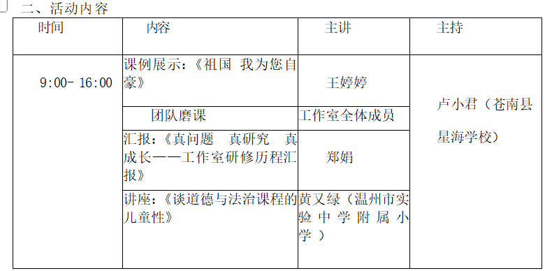 为促进工作室学员专业成长,加强课堂教学研究与实践交流,提升小学道德与法治课程的教学质量与科研能力,经研究,决定举办温州市黄又绿名师工作室专题研修活动。现将有关事项通知如下: