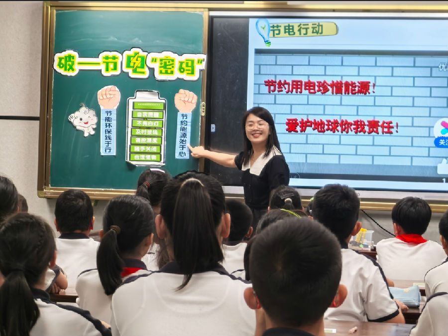 《节电行动进行时》:瑞安市第二实验小学的胡冬梅老师(瑞安市教坛中坚)则通过趣味横生的课堂互动,让学生们深刻体会到节能减排的意义,激发了他们参与环保行动的积极性。课上,胡老师先借趣味互动带学生认识电、了解电的来源;接着聚焦浪费电现象,通过学生调查汇报、数据呈现,让大家意识到电资源珍贵;随后经小组讨论,得出“不亮白日灯”等节电妙招,借盲盒游戏巩固知识;最后落脚行动,从了解1度电作用,到号召参与“地球一小时”、打卡节电,还延伸至节水等能源节约,传递绿色理念,助力打造节能校园 。